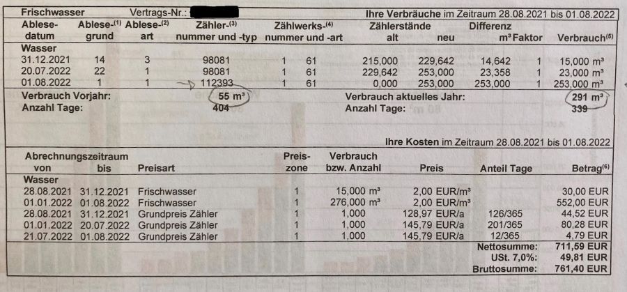 Від енергопостачальника надійшов шокуючий рахунок: вимагають доплатити понад 850 євро та збільшили місячний платіж на 75 євро за світло, газ і воду. Що робити? Консультація споживачів рекомендує спочатку ретельно перевірити рахунок. Відповідно до переліку на цей рік споживання води зросло більш ніж у п’ять разів порівняно з минулим роком. Щоб виключити, що в перерахунку сталась помилка потрібно звернутись до енергопостачальника та відправити електронний лист із назвою, адресою, рахунком за договором і фотографією поточного стану лічильника води. Потім рахунок буде перевірено та виправлено, якщо буде якась помилка. Рішення не завжди просте. Споживачі можуть звернутися до безкоштовного закладу – енергетичного арбітражу, якщо вони зіткнуться з проблемами. Інформація про скарги та розгляд заяв в цілому доступна на сайті Федерального мережевого агентства: https://www.bundesnetzagentur.de/DE/Vportal/Energie/BeschwerdeSchlichtung/start.html для отримання додаткової інформації та онлайн-заявки на безкоштовний арбітраж можна знайти за адресою https://www.schlichtungsstelle-energie.de/was-tun-bei-problemen-mit-dem-Provider.htmltun22082402