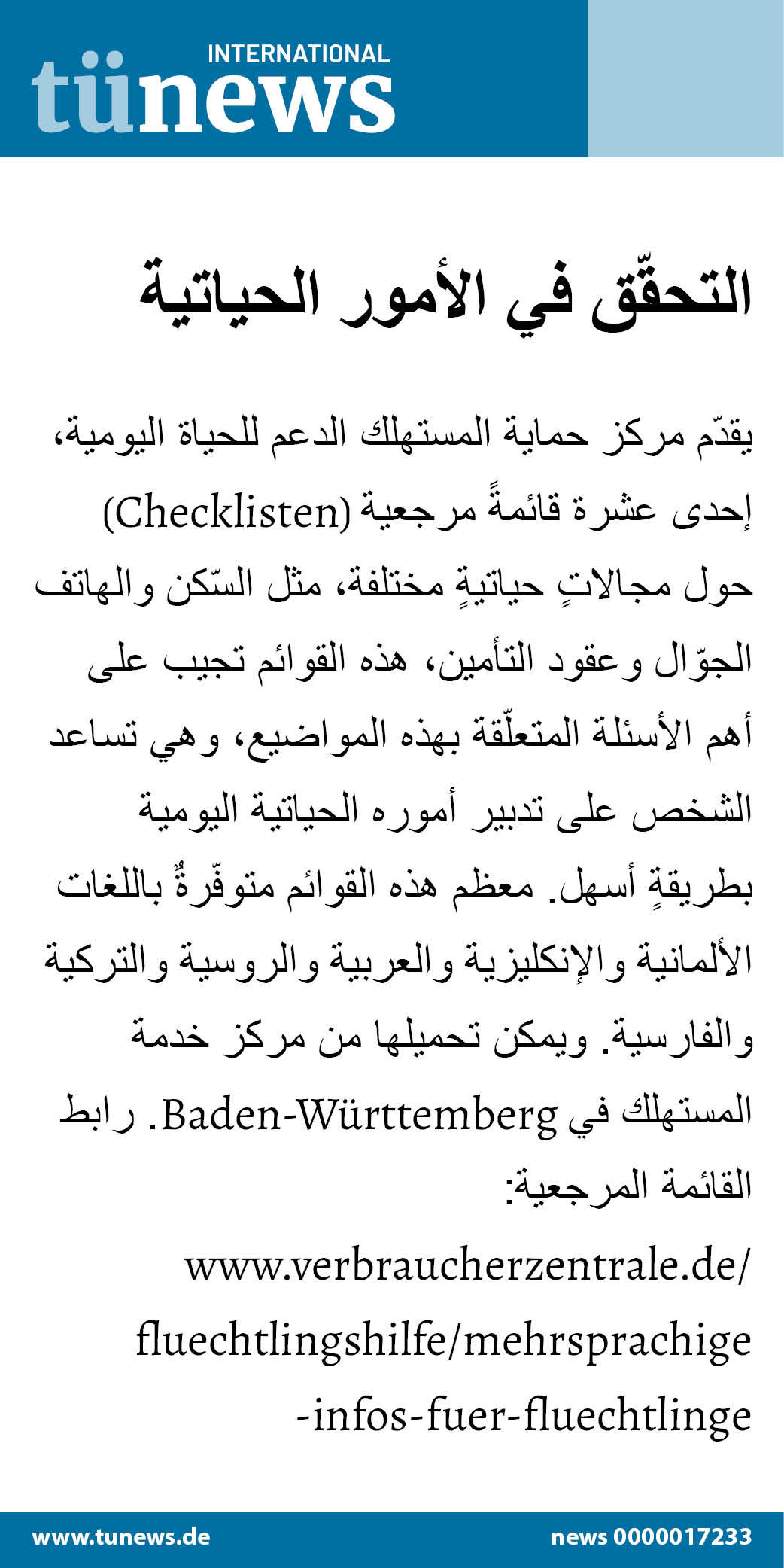 يقدّم مركز حماية المستهلك الدعم للحياة اليومية، إحدى عشرة قائمةً مرجعية (Checklisten) حول مجالاتٍ حياتيةٍ مختلفة، مثل السّكن والهاتف الجوّال وعقود التأمين، هذه القوائم تجيب على أهم الأسئلة المتعلّقة بهذه المواضيع، وهي تساعد الشخص على تدبير أموره الحياتية اليومية بطريقةٍ أسهل. معظم هذه القوائم متوفّرةٌ باللغات الألمانية والإنكليزية والعربية والروسية والتركية والفارسية. ويمكن تحميلها من مركز خدمة المستهلك في Baden-Württemberg. رابط القائمة المرجعية: