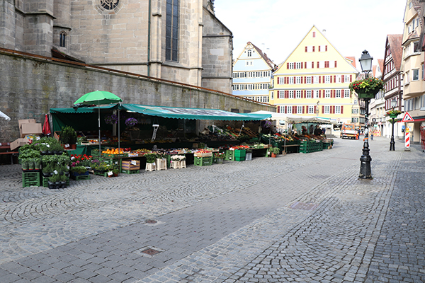Marktstände auf dem Tübinger Holzmarkt. Foto: tünews INTERNATIONAL / Mostafa Elyasian.