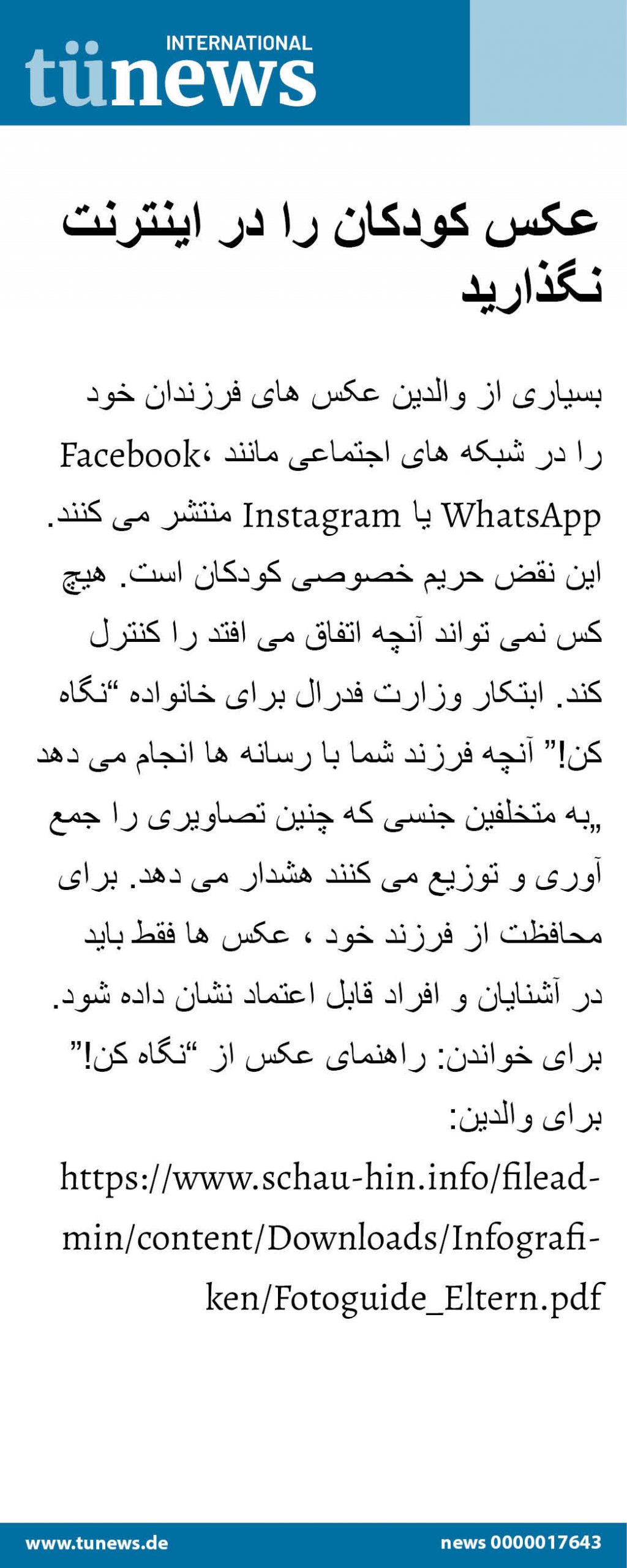 بسیاری از والدین عکس های فرزندان خود را در شبکه های اجتماعی مانند Facebook، WhatsApp یا Instagram منتشر می کنند. این نقض حریم خصوصی کودکان است. هیچ کس نمی تواند آنچه اتفاق می افتد را کنترل کند. ابتکار وزارت فدرال برای خانواده ”نگاه کن!“ آنچه فرزند شما با رسانه ها انجام می دهد „به متخلفین جنسی که چنین تصاویری را جمع آوری و توزیع می کنند هشدار می دهد. برای محافظت از فرزند خود ، عکس ها فقط باید در آشنایان و افراد قابل اعتماد نشان داده شود. برای خواندن: راهنمای عکس از ”نگاه کن!“ برای والدین: