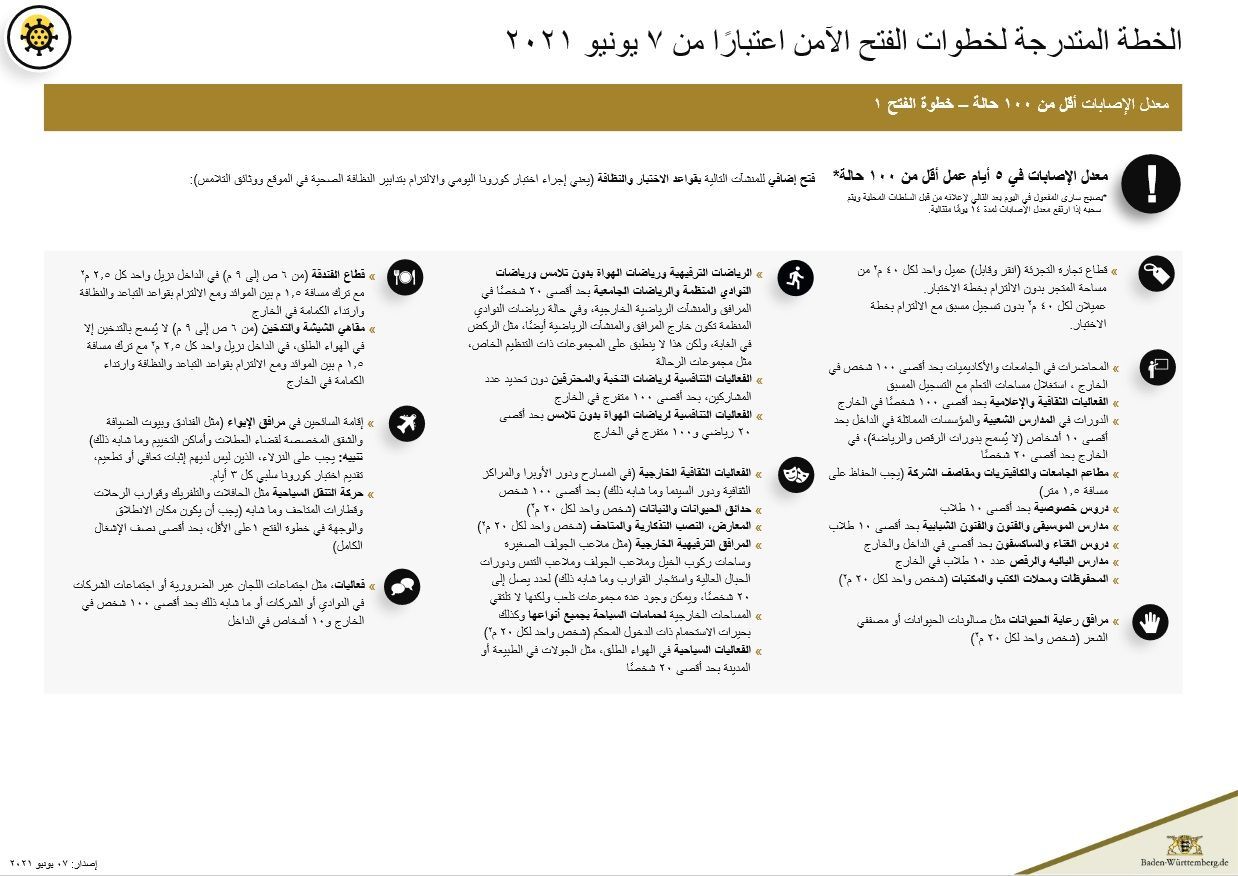 اعدت رئاسة مجلس الوزراء في مقاطعة ولاية بادن فورتمبيرغ اشكال توضيحية تتضمن كافة المعلومات عن قواعد كورونا. توجد المعلومات باللغات الإنكليزية والعربية والفارسية والفرنسية والإيطالية والإسبانية والتركية والبولونية والرومانية والروسية. وهي توضح القواعد التي تطبق عندما يكون معدل الإصابة بفيروس كورونا أقل من ١٠٠ حالة وأقل من ٥٠ حالة وأقل من ٣٥ حالة. بالإضافة إلى ذلك فإنها تشير إلى الظروف التي يمكن على أساسها اتخاذ مزيد من الخطوات لتخفيف قواعد كورونا في حالة حدوث أقل من ١٠٠ حالة. في الوقت الحالي معدل الإصابة في توبنغن أقل من ٣٥حالة.