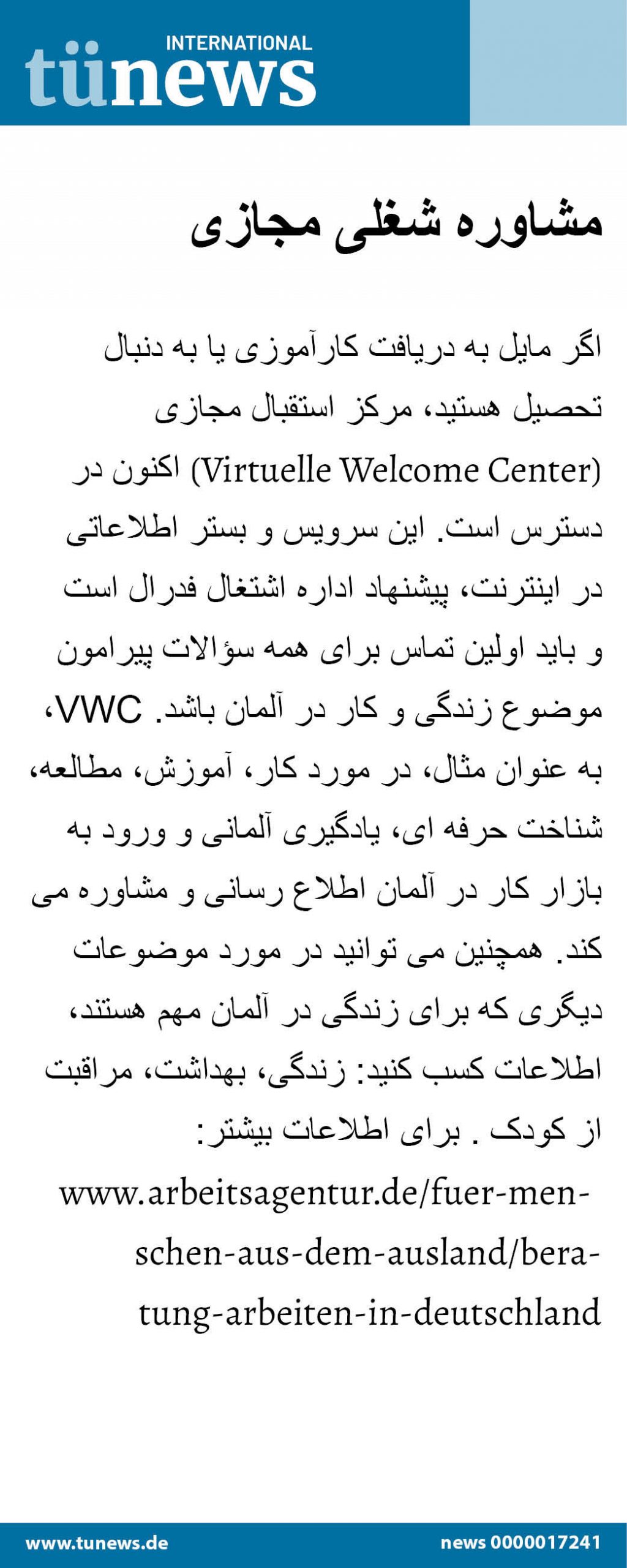 اگر مایل به دریافت کارآموزی یا به دنبال تحصیل هستید، مرکز استقبال مجازی (Virtuelle Welcome Center) اکنون در دسترس است. این سرویس و بستر اطلاعاتی در اینترنت، پیشنهاد اداره اشتغال فدرال است و باید اولین تماس برای همه سؤالات پیرامون موضوع زندگی و کار در آلمان باشد. VWC، به عنوان مثال، در مورد کار، آموزش، مطالعه، شناخت حرفه ای، یادگیری آلمانی و ورود به بازار کار در آلمان اطلاع رسانی و مشاوره می کند. همچنین می توانید در مورد موضوعات دیگری که برای زندگی در آلمان مهم هستند، اطلاعات کسب کنید: زندگی، بهداشت، مراقبت از کودک . برای اطلاعات بیشتر:
