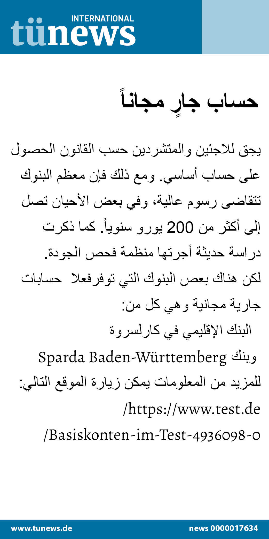 حساب جارٍ مجاناً – يحِق للاجئين والمتشردين حسب القانون الحصول على حساب
