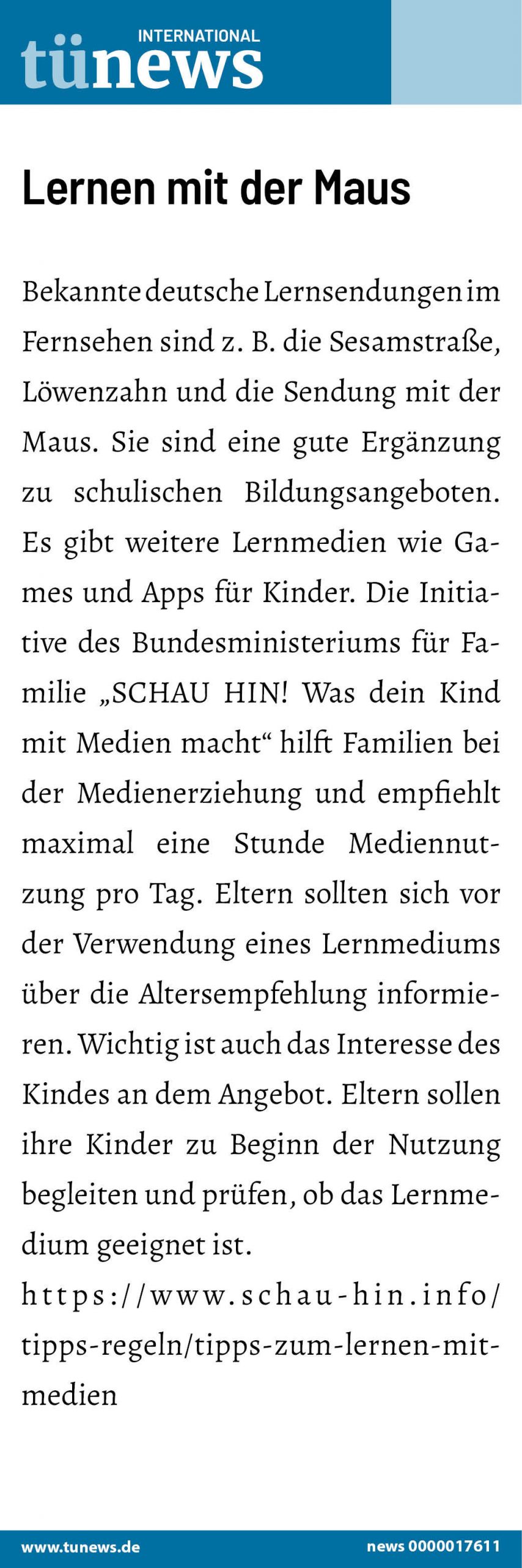 Altersempfehlung, Apps für Kinder, Bundesministeriums für Familie, Games, hilft Familien, Lernen, Maus, VerwendungBekannte deutsche Lernsendungen im Fernsehen sind z. B. die Sesamstraße,