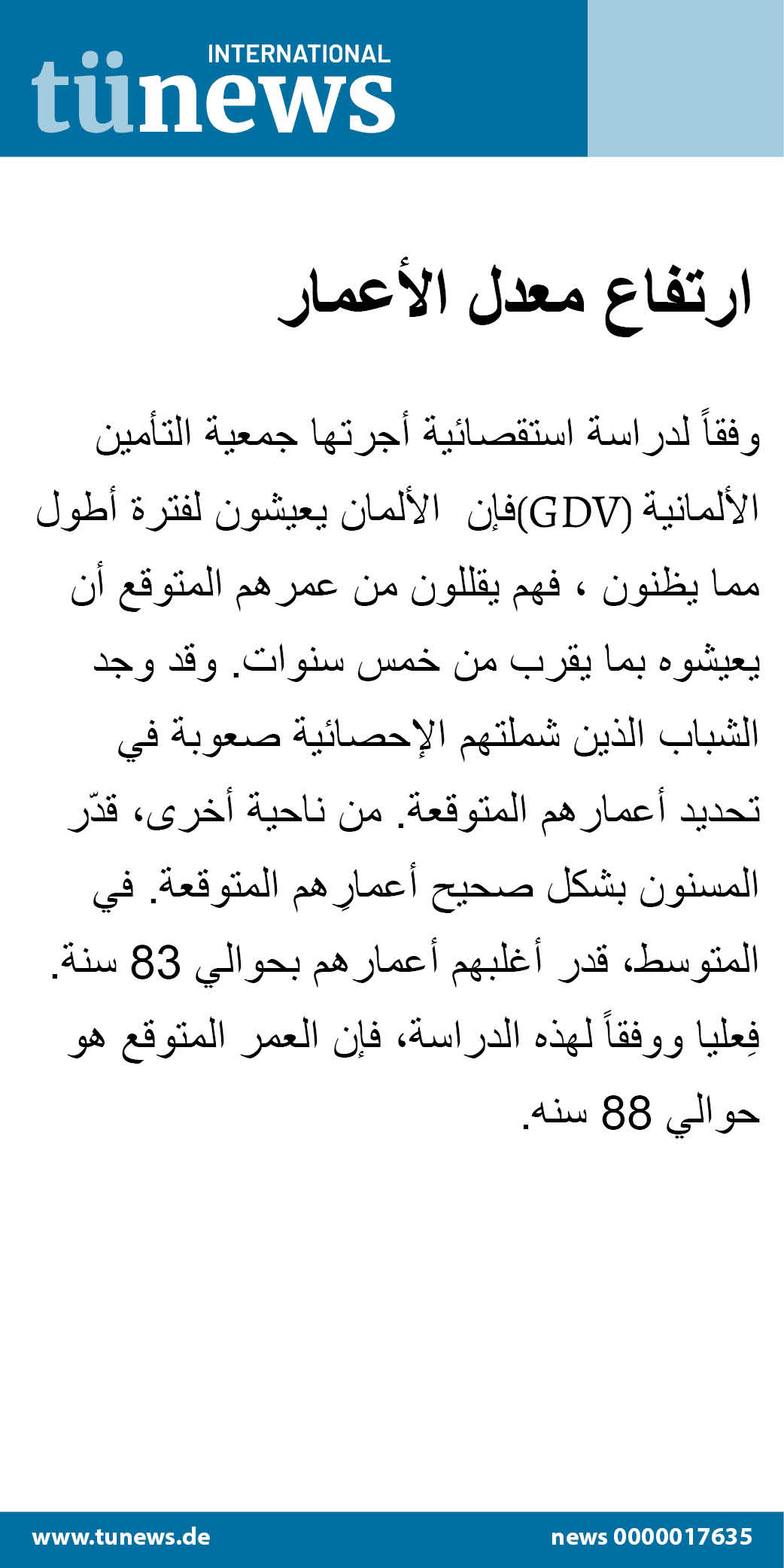 وفقاً لدراسة استقصائية أجرتها جمعية التأمين الألمانية (GDV)فإن الألمان يعيشون لفترة أطول مما يظنون ، فهم يقللون من عمرهم المتوقع…