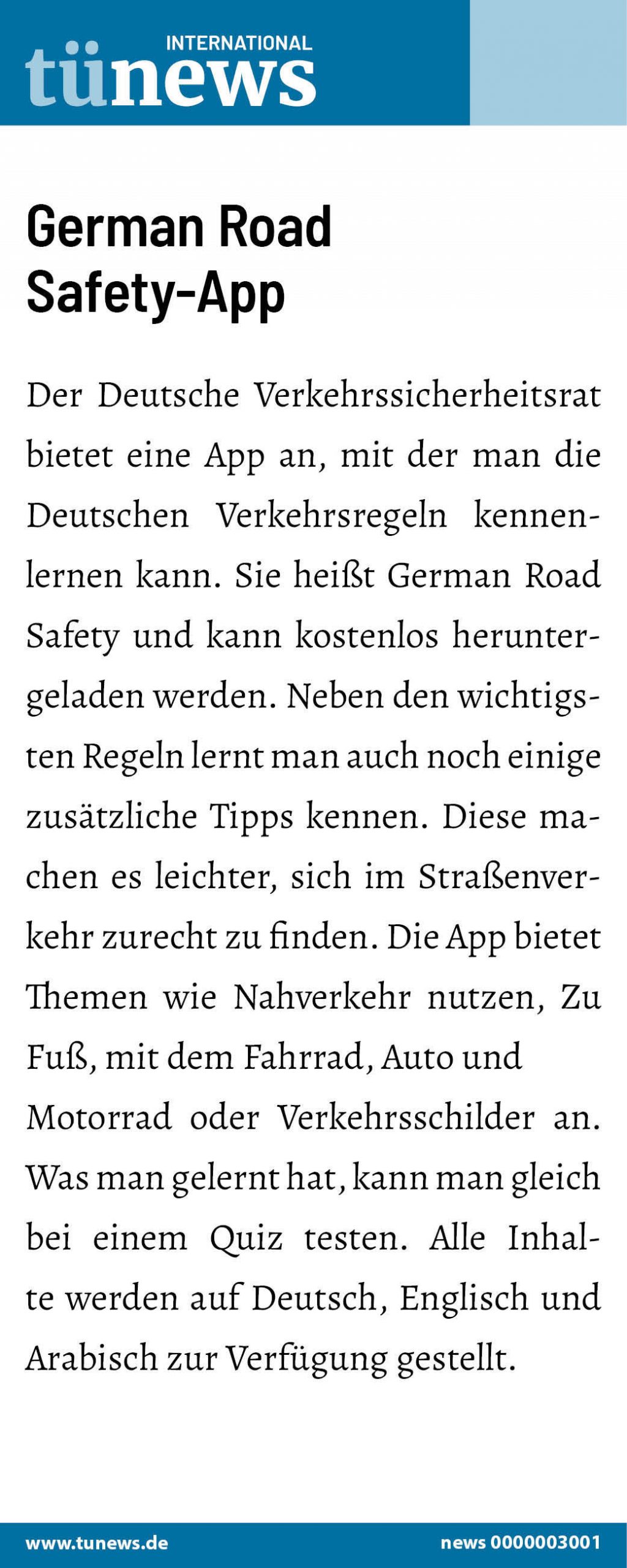 Der Deutsche Verkehrssicherheitsrat bietet eine App an, mit der man die Deutschen Verkehrsregeln kennenlernen kann. Sie heißt German Road Safety…