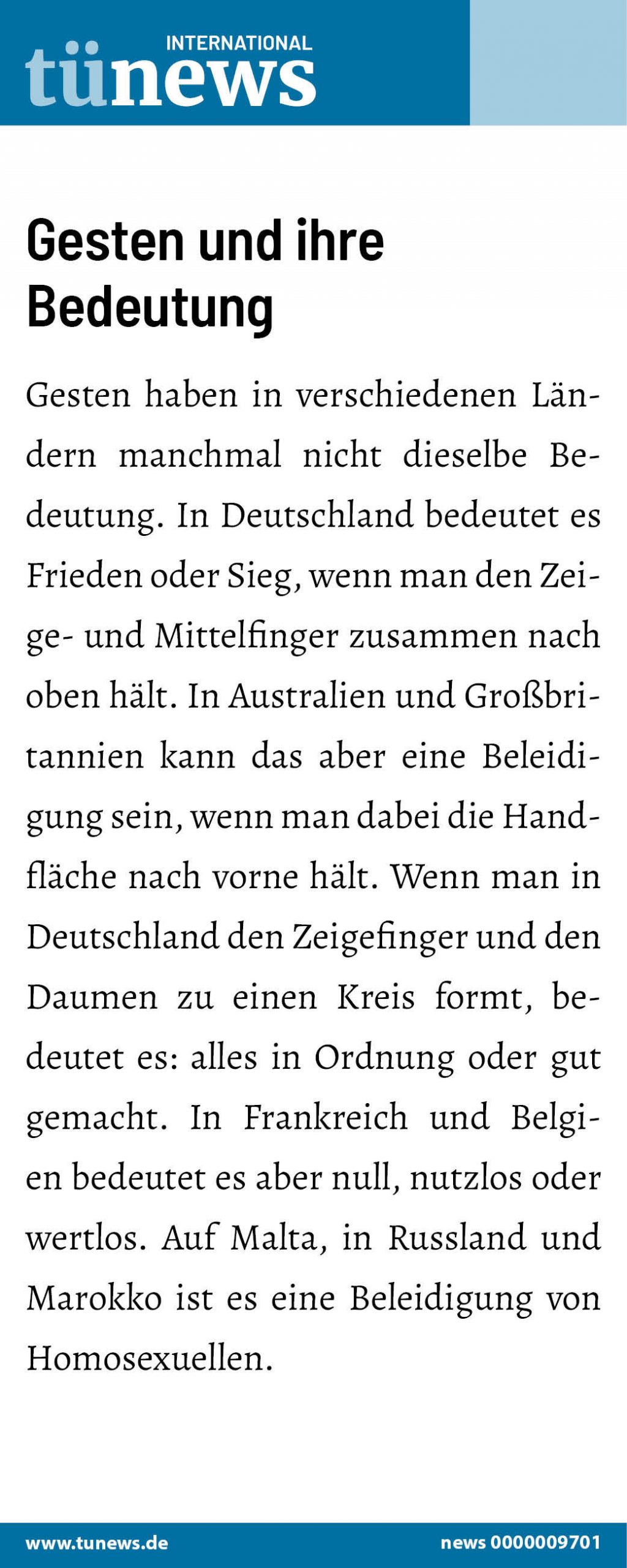 Gesten haben in verschiedenen Ländern manchmal nicht dieselbe Bedeutung. In Deutschland bedeutet es Frieden oder Sieg,