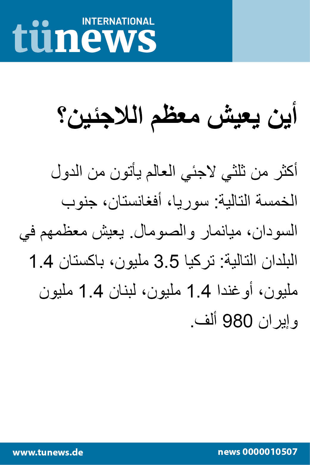 أكثر من ثلثي لاجئي العالم يأتون من الدول الخمسة التالية: سوريا، أفغانستان، جنوب السودان،