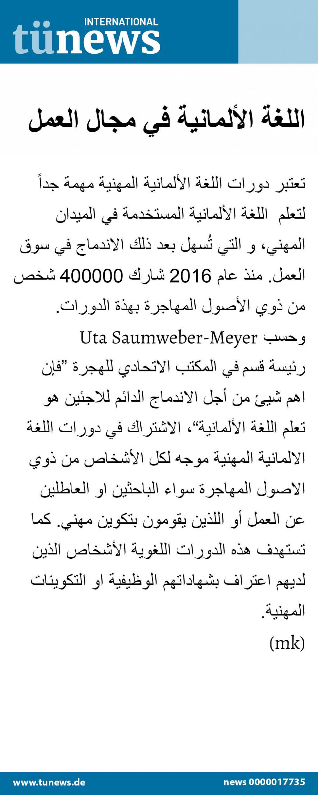 Uta Saumweber-Meyer رئيسة قسم في المكتب الاتحادي للهجرة “اهم شيئ من أجل الاندماج الدائم للاجئين هو تعلم اللغة الألمانية”، الاشتراك في دورات اللغة الالمانية المهنية موجه لكل الأشخاص من ذوي الاصول المهاجرة سواء الباحثين او العاطلين عن العمل أو اللذين يقومون بتكوين مهني. كما تستهدف هذه الدورات اللغوية الأشخاص الذين لديهم اعتراف بشهاداتهم الوظيفية او التكوينات المهنية.
