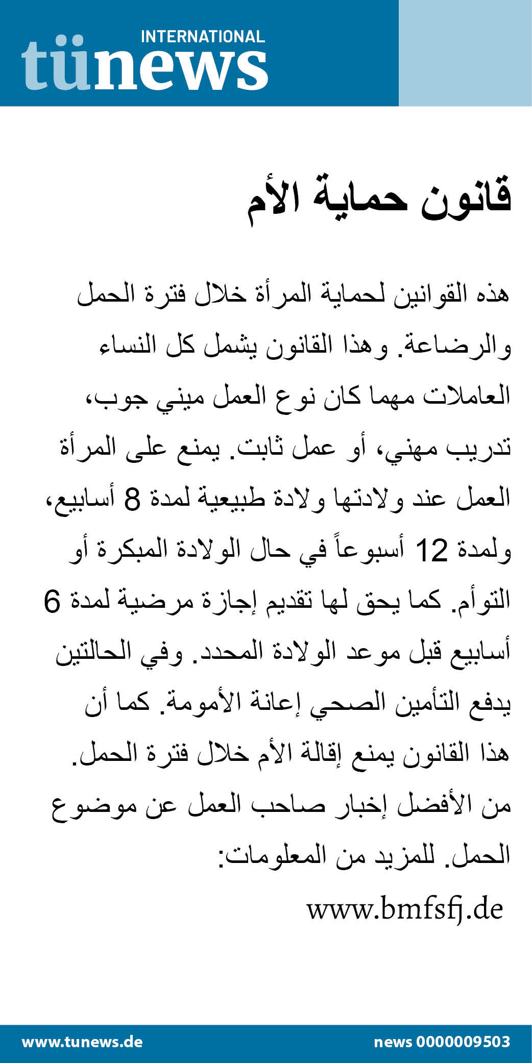 هذه القوانين لحماية المرأة خلال فترة الحمل والرضاعة. وهذا القانون يشمل كل النساء العاملات مهما