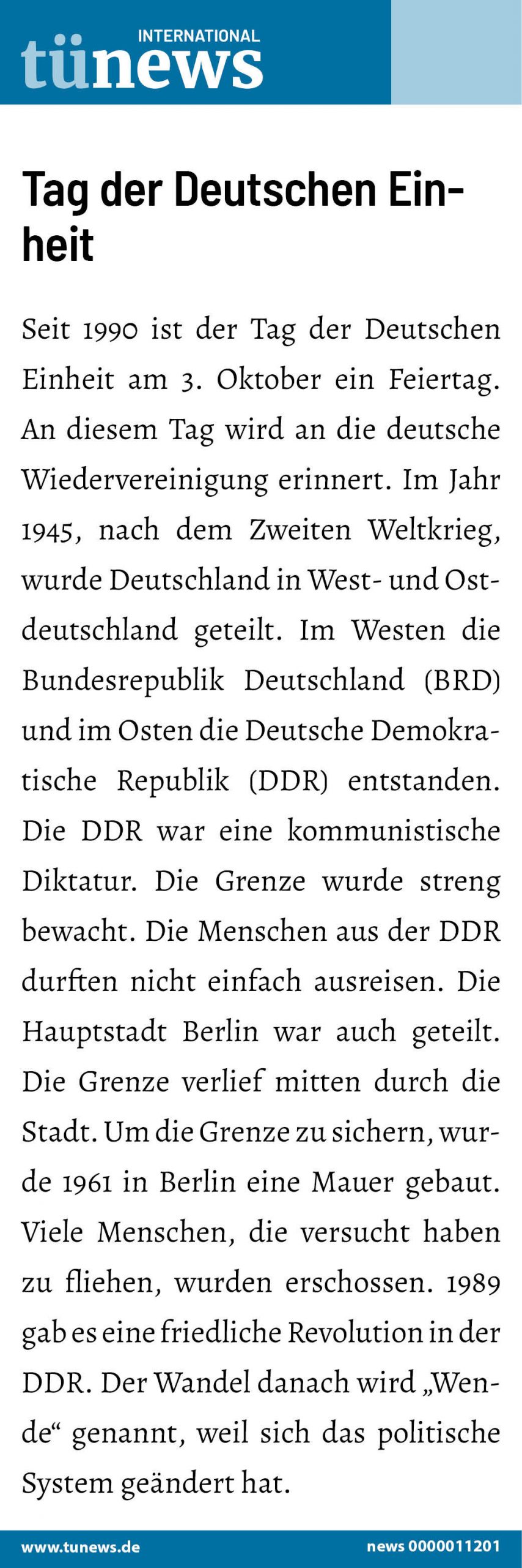 Seit 1990 ist der Tag der Deutschen Einheit am 3. Oktober ein Feiertag.,,