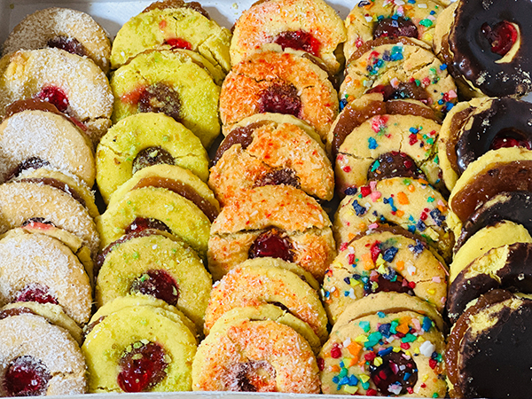 Unter den vielfältigen iranischen Süßigkeiten hat das sogenannte shirini-ye almani – das Deutsche Gebäck – einen ganz besonderen Platz im Herzen vieler Iranerinnen und Iraner. Es handelt sich um ein rundes, zartes Doppelkeksgebäck mit einer dünnen Schicht Marmelade (oft Kirsch- oder Erdbeermarmelade) in der Mitte. Die zwei Hälften sind oft unterschiedlich gefärbt – hell und schokoladig – und erinnern viele Menschen an ihre Kindheit und an das persische Neujahrsfest Nowruz.