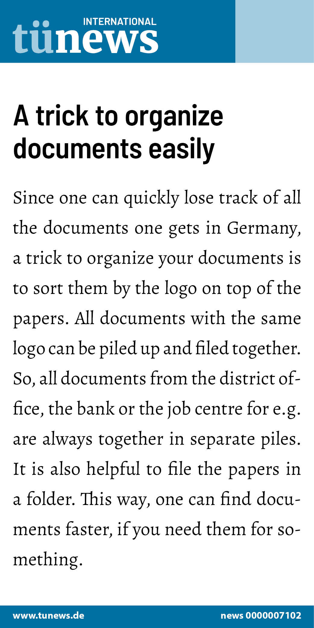 All documents with the same logo can be piled up and filed together. So, all documents from the district office, the bank or the job centre for e.g. are always together in separate piles. It is also helpful to file the papers in a folder. This way, one can find documents faster, if you need them for something.