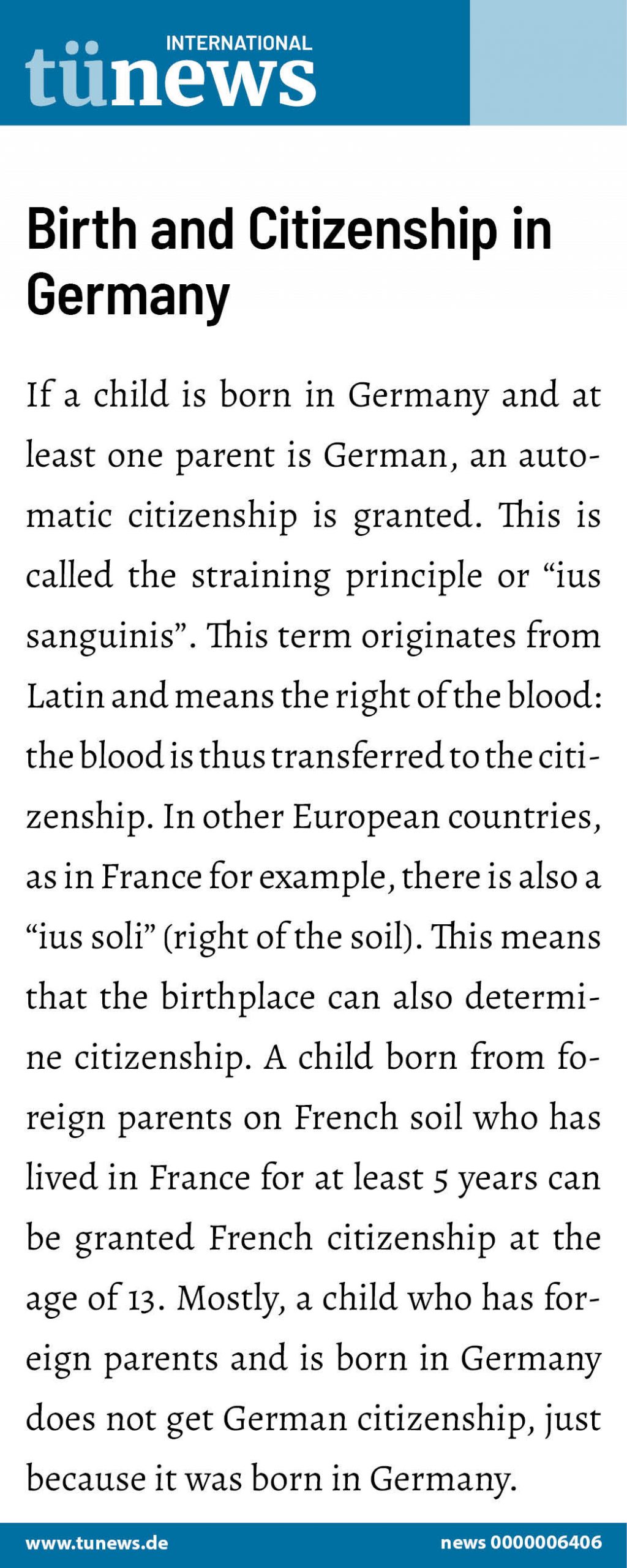 This is called the straining principle or “ius sanguinis”. This term originates from Latin and means the right of the blood: the blood is thus transferred to the citizenship. In other European countries, as in France for example, there is also a “ius soli” (right of the soil). This means that the birthplace can also determine citizenship. A child born from foreign parents on French soil who has lived in France for at least 5 years can be granted French citizenship at the age of 13. Mostly, a child who has foreign parents and is born in Germany does not get German citizenship, just because it was born in Germany.