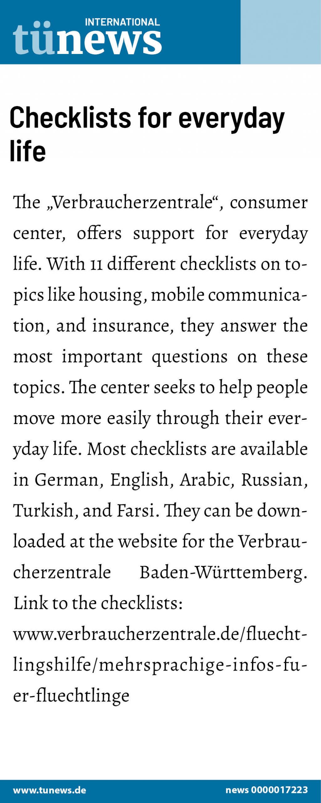 The „Verbraucherzentrale“, consumer center, offers support for everyday life. With 11 different checklists on topics like housing, mobile communication, and insurance, they answer the most important questions on these topics. The center seeks to help people move more easily through their everyday life. Most checklists are available in German, English, Arabic, Russian, Turkish, and Farsi. They can be downloaded at the website for the Verbraucherzentrale Baden-Württemberg. Link to the checklists: