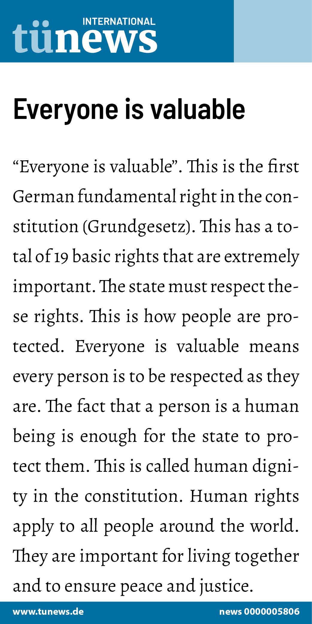 (Grundgesetz). This has a total of 19 basic rights that are extremely important. The state must respect these rights. This is how people are protected. Everyone is valuable means every person is to be respected as they are. The fact that a person is a human being is enough for the state to protect them. This is called human dignity in the constitution. Human rights apply to all people around the world. They are important for living together and to ensure peace and justice.