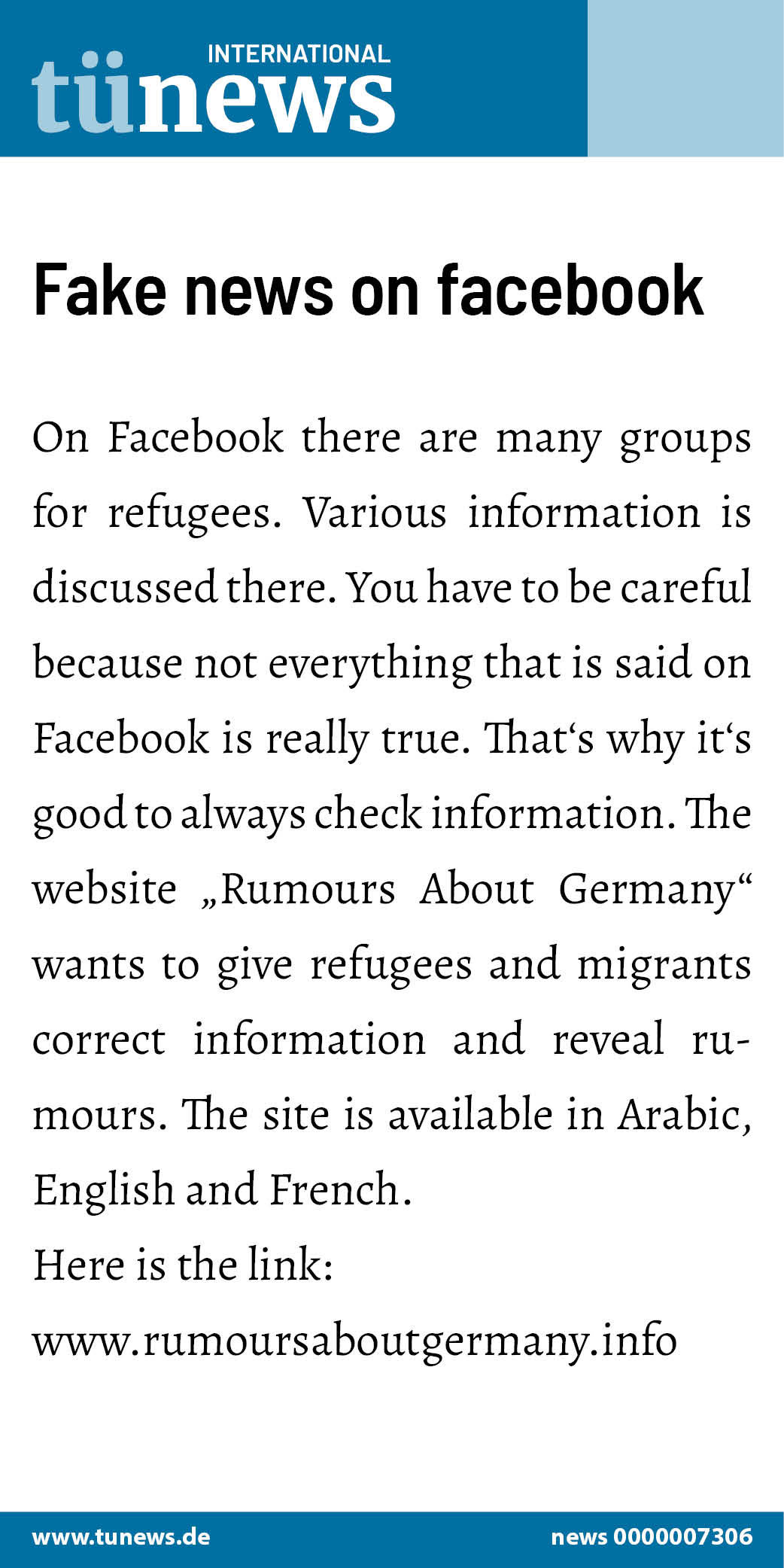 discussed there. You have to be careful because not everything that is said on Facebook is really true. That’s why it’s good to always check information. The website “Rumours About Germany” wants to give refugees and migrants correct information and reveal rumours. The site is available in Arabic, English and French. Here is the link: www.rumoursaboutgermany.info