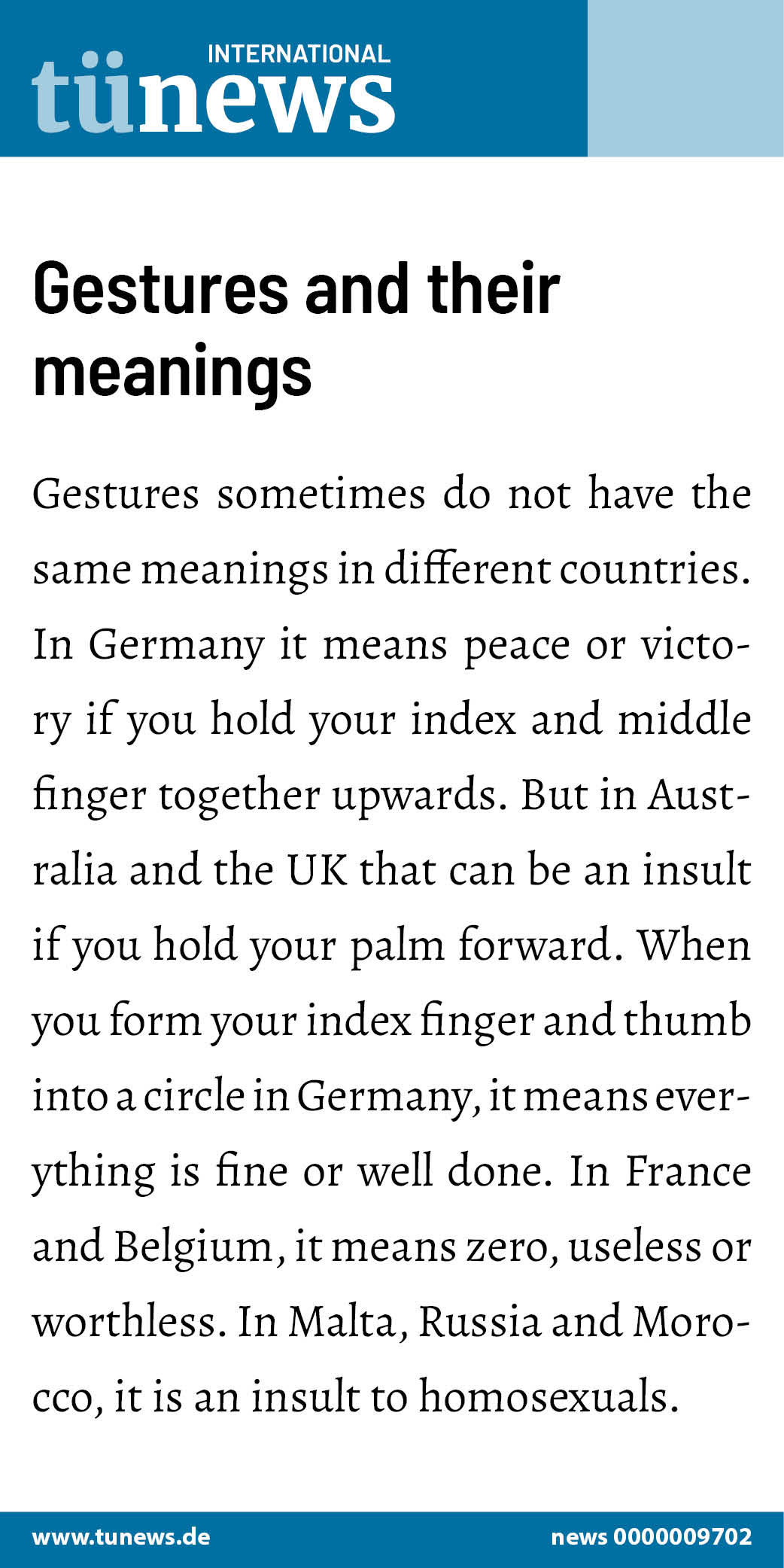 But in Australia and the UK that can be an insult if you hold your palm forward. When you form your index finger and thumb into a circle in Germany, it means everything is fine or well done. In France and Belgium, it means zero, useless or worthless. In Malta, Russia and Morocco, it is an insult to homosexuals.