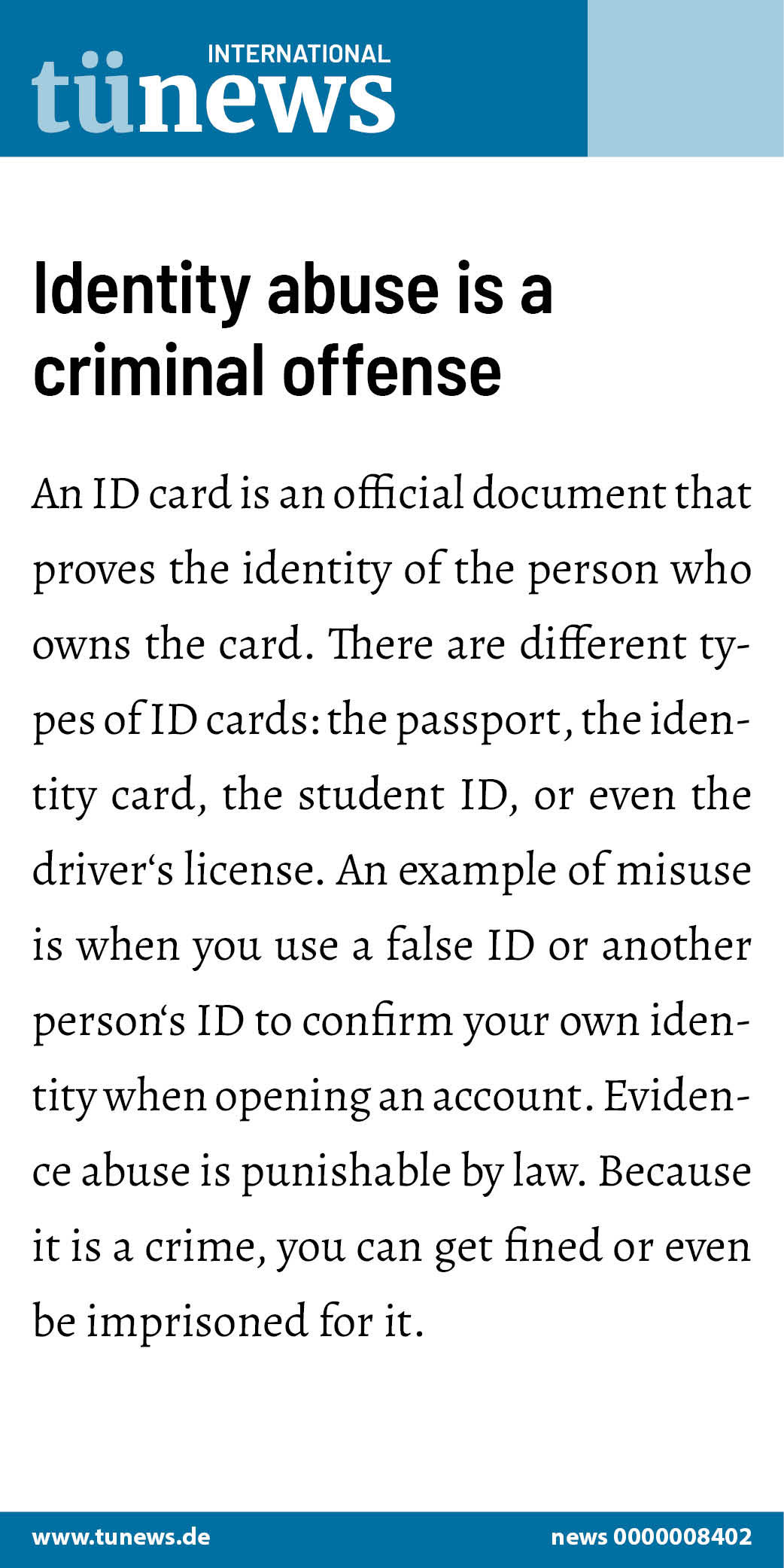 There are different types of ID cards: the passport, the identity card, the student ID, or even the driver’s license. An example of misuse is when you use a false ID or another person’s ID to confirm your own identity when opening an account. Evidence abuse is punishable by law. Because it is a crime, you can get fined or even be imprisoned for it.