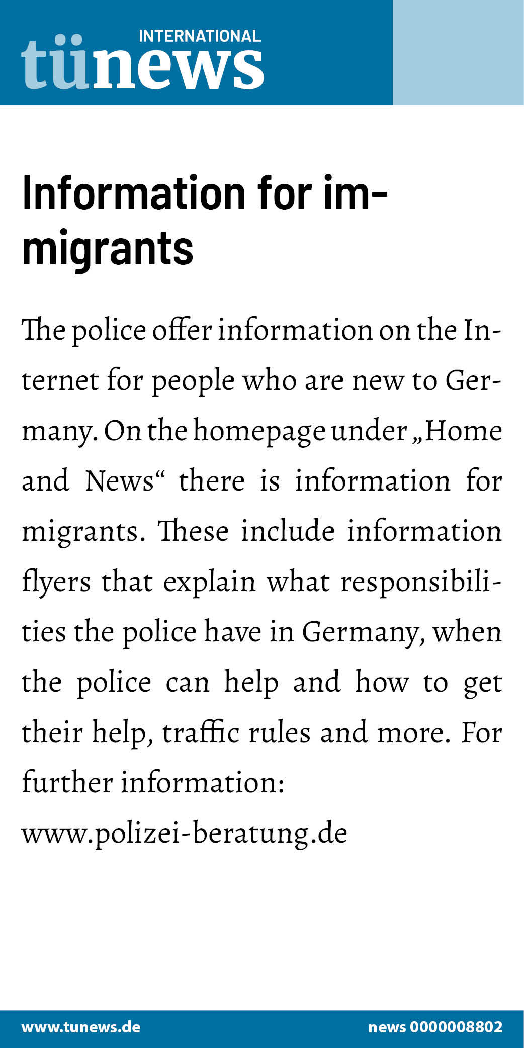 On the homepage under “Home and News” there is information for migrants. These include information flyers that explain what responsibilities the police have in Germany, when the police can help and how to get their help, traffic rules and more. For further information: www.polizei-beratung.de