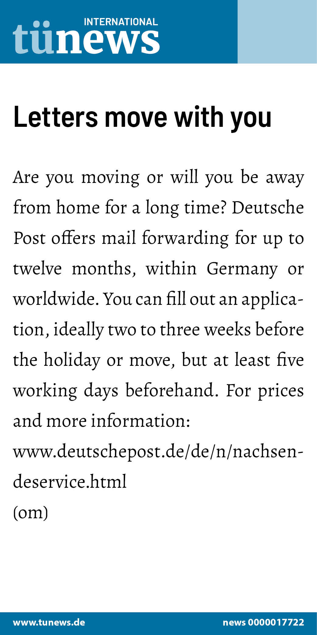 Are you moving or will you be away from home for a long time? Deutsche Post offers mail forwarding for up to twelve months, within Germany or worldwide. You can fill out an application, ideally two to three weeks before the holiday or move, but at least five working days beforehand. For prices and more information: www.deutschepost.de/de/n/nachsendeservice.html