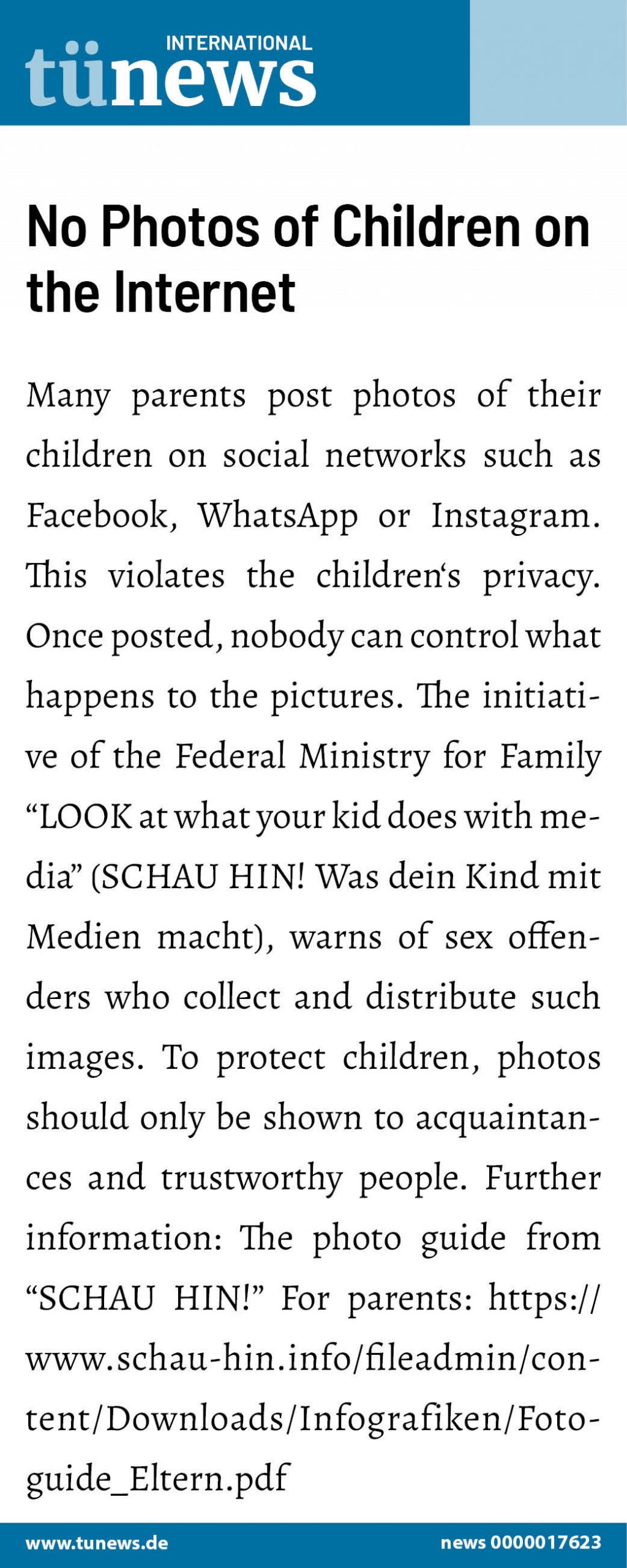 WhatsApp or Instagram. This violates the children’s privacy. Once posted, nobody can control what happens to the pictures. The initiative of the Federal Ministry for Family “LOOK at what your kid does with media” (SCHAU HIN! Was dein Kind mit Medien macht), warns of sex offenders who collect and distribute such images. To protect children, photos should only be shown to acquaintances and trustworthy people. Further information: The photo guide from “SCHAU HIN!” For parents: https://www.schau-hin.info/fileadmin/content/Downloads/Infografiken/Fotoguide_Eltern.pdf