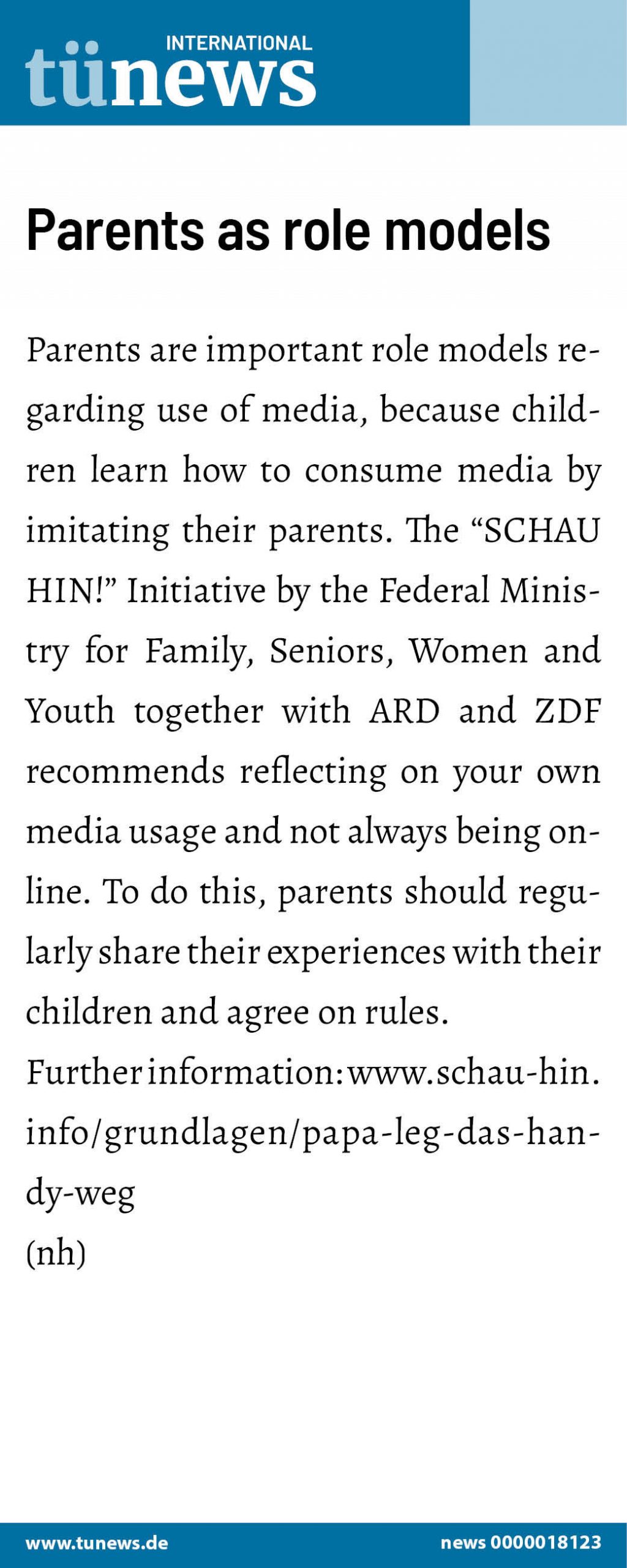 Parents are important role models regarding use of media, because children learn how to consume media by imitating their parents. The “SCHAU HIN!” Initiative by the Federal Ministry for Family, Seniors, Women and Youth together with ARD and ZDF recommends reflecting on your own media usage and not always being online. To do this, parents should regularly share their experiences with their children and agree on rules.