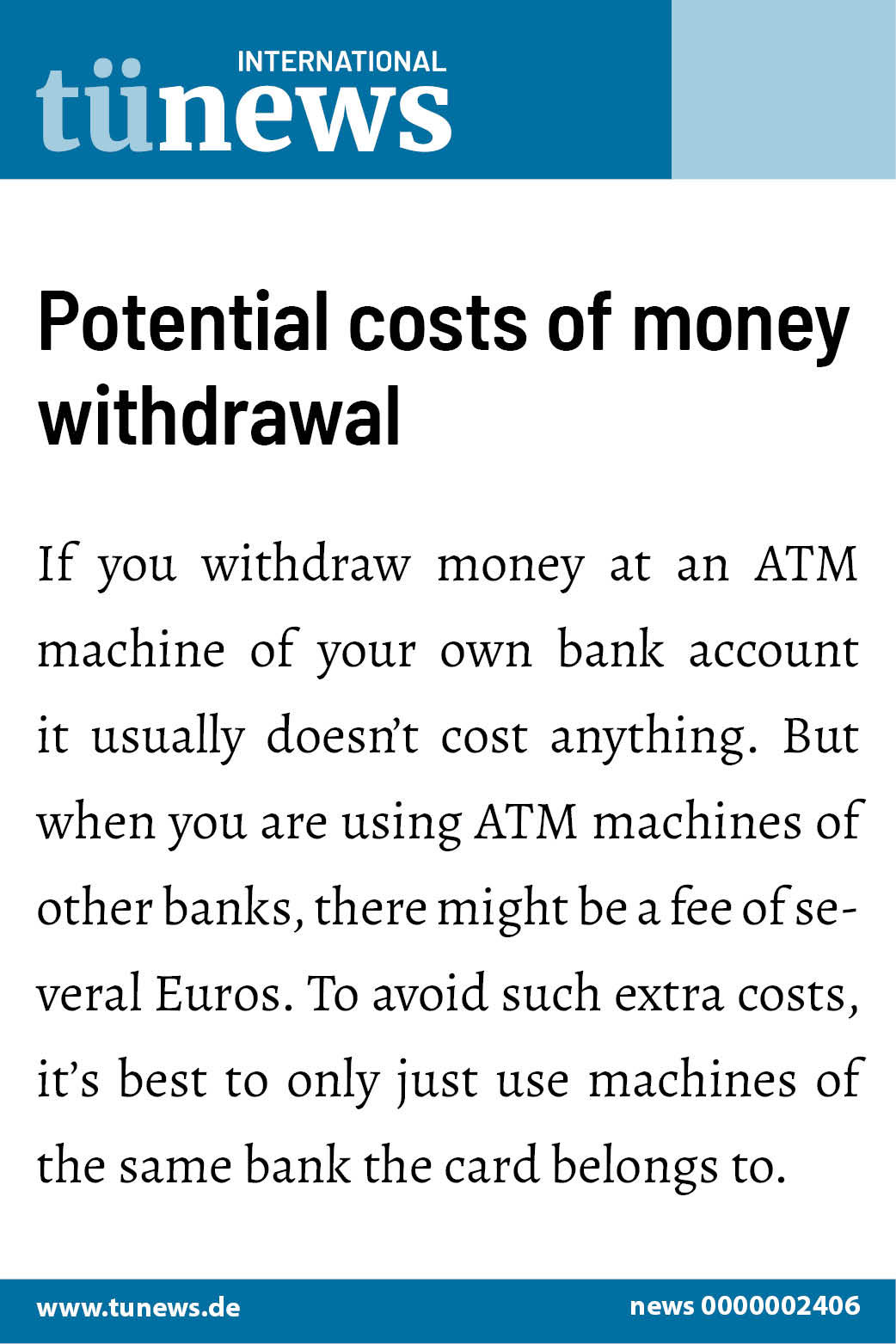 But when you are using ATM machines of other banks, there might be a fee of several Euros. To avoid such extra costs, it’s best to only just use machines of the same bank the card belongs to.