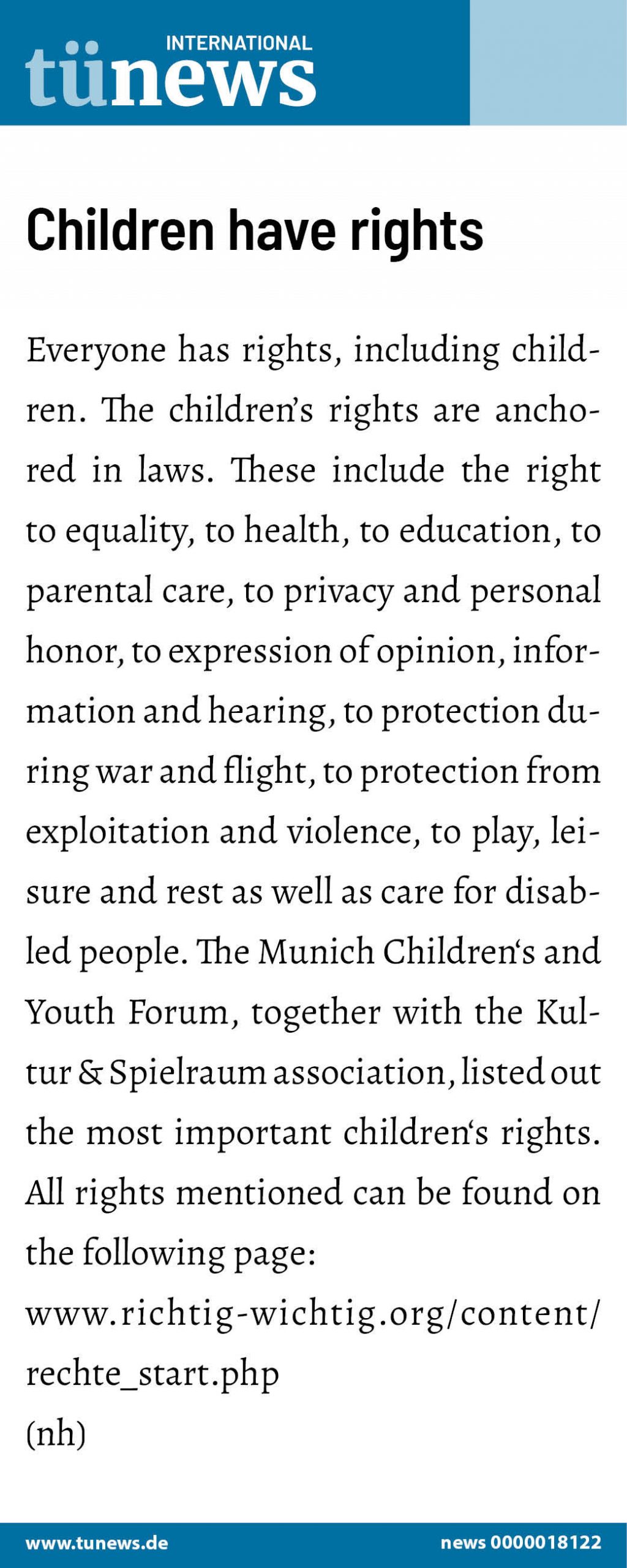 Everyone has rights, including children. The children’s rights are anchored in laws. These include the right to equality, to health, to education, to parental care, to privacy and personal honor, to expression of opinion, information and hearing, to protection during war and flight, to protection from exploitation and violence, to play, leisure and rest as well as care for disabled people. The Munich Children’s and Youth Forum, together with the Kultur & Spielraum association, listed out the most important children’s rights. All rights mentioned can be found on the following page: www.richtig-wichtig.org/content/rechte_start.php