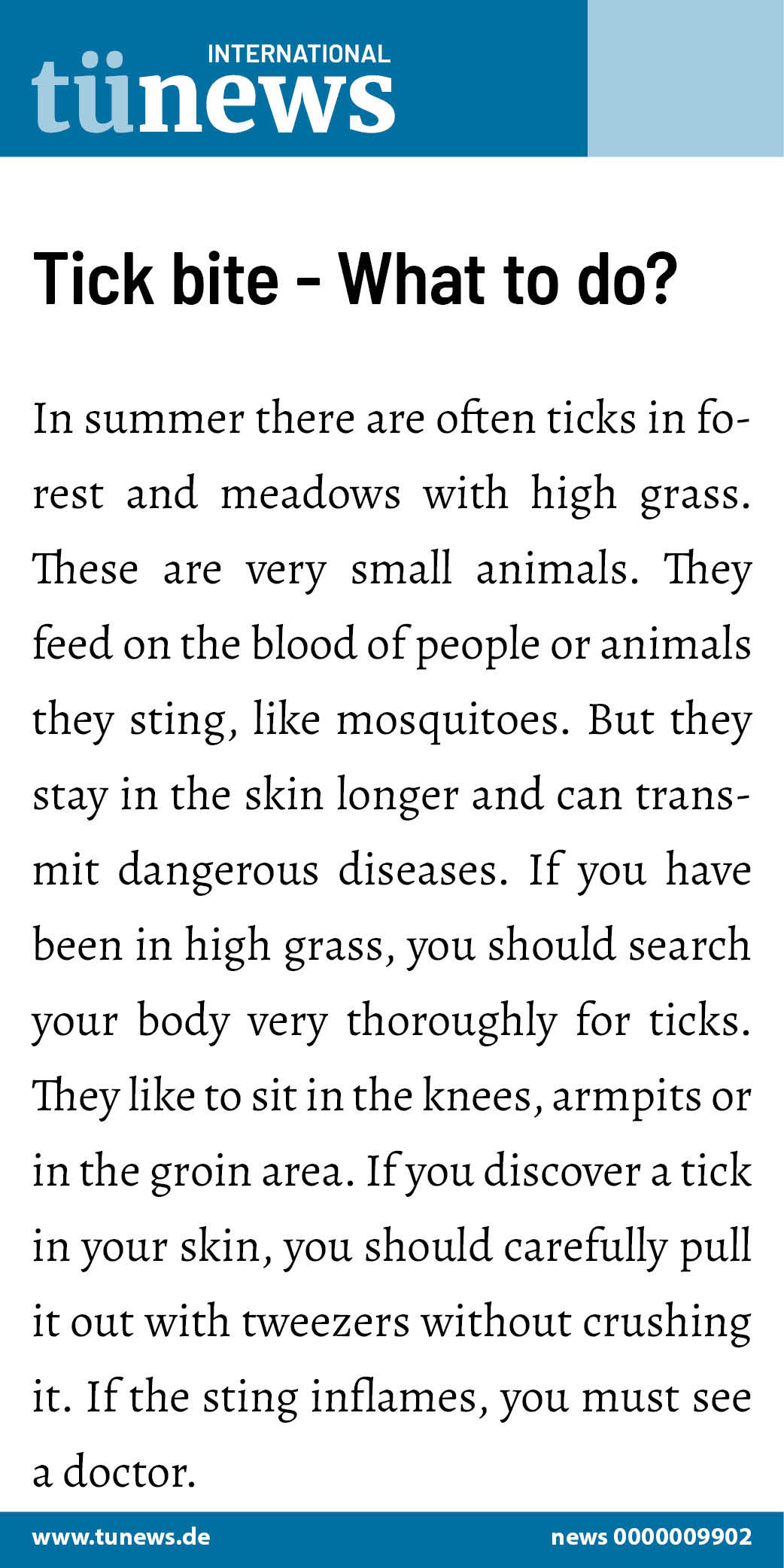 They feed on the blood of people or animals they sting, like mosquitoes. But they stay in the skin longer and can transmit dangerous diseases. If you have been in high grass, you should search your body very thoroughly for ticks. They like to sit in the knees, armpits or in the groin area. If you discover a tick in your skin, you should carefully pull it out with tweezers without crushing it. If the sting inflames, you must see a doctor.