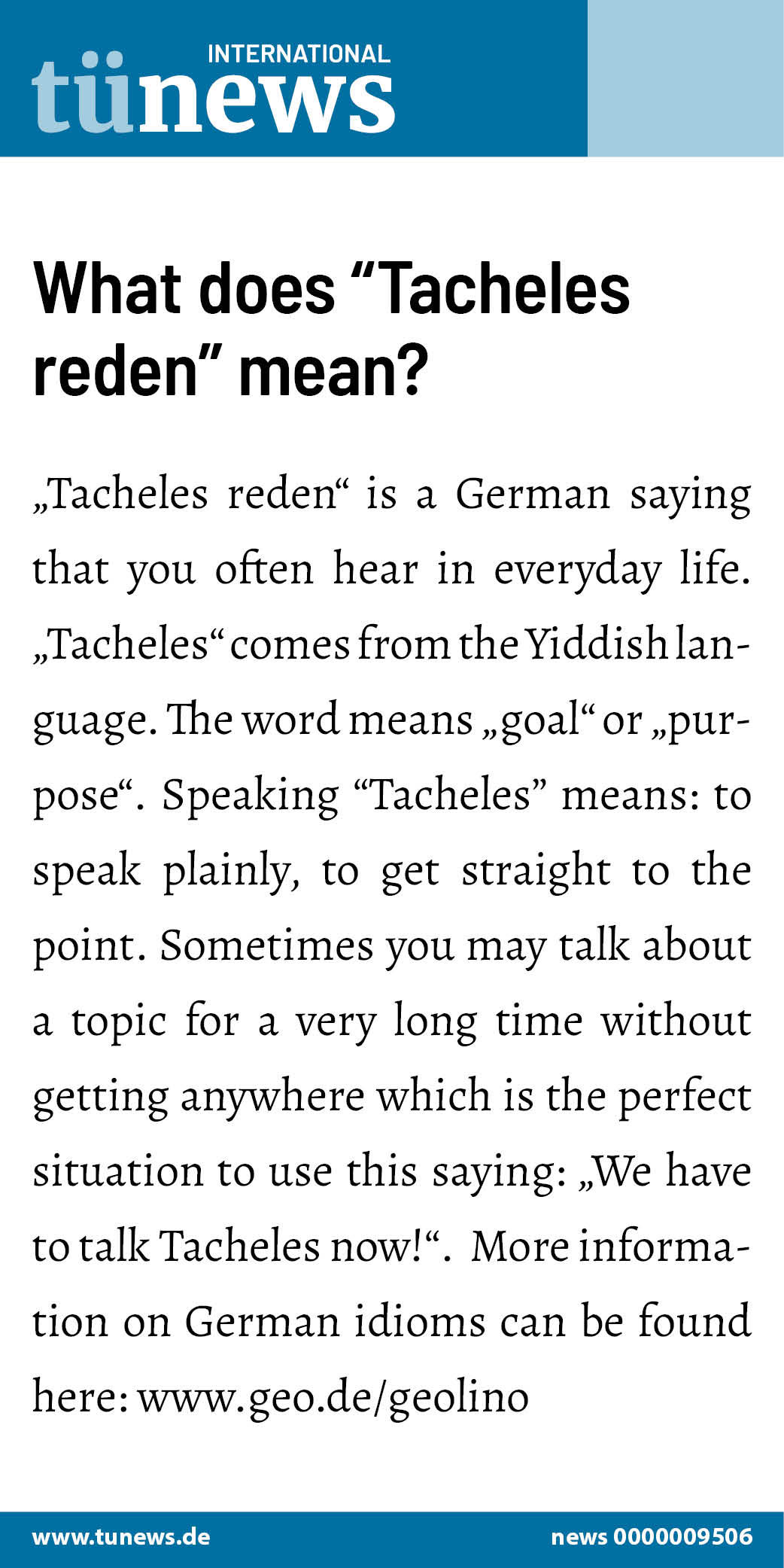 The word means “goal” or “purpose”. Speaking “Tacheles” means: to speak plainly, to get straight to the point. Sometimes you may talk about a topic for a very long time without getting anywhere which is the perfect situation to use this saying: “We have to talk Tacheles now!”. More information on German idioms can be found here: www.geo.de/geolino