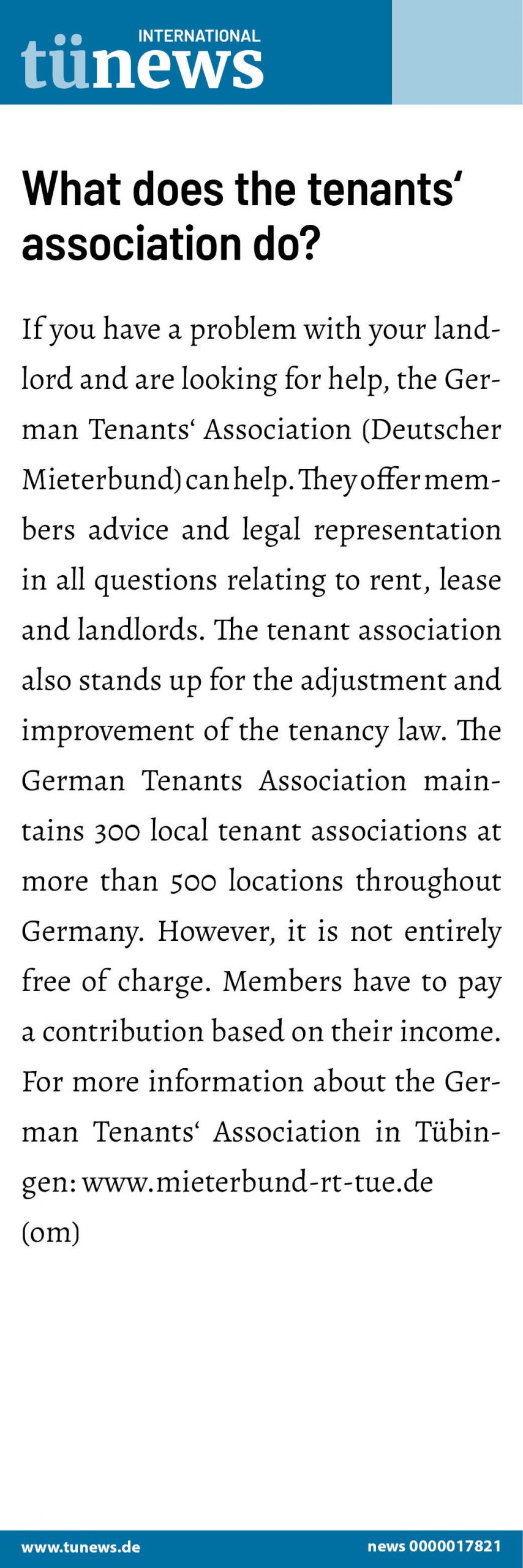If you have a problem with your landlord and are looking for help, the German Tenants’ Association (Deutscher Mieterbund) can help. They offer members advice and legal representation in all questions relating to rent, lease and landlords. The tenant association also stands up for the adjustment and improvement of the tenancy law. The German Tenants Association maintains 300 local tenant associations at more than 500 locations throughout Germany. However, it is not entirely free of charge. Members have to pay a contribution based on their income. For more information about the German Tenants’ Association in Tübingen: www.mieterbund-rt-tue.de