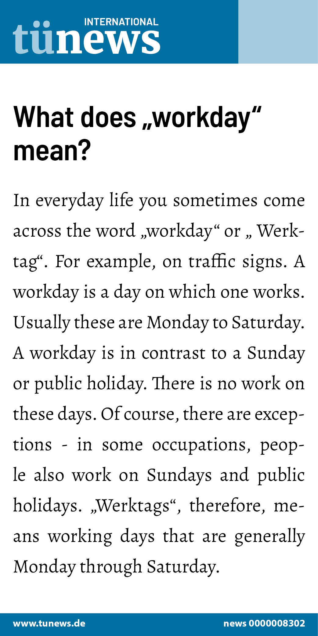 on traffic signs. A workday is a day on which one works. Usually these are Monday to Saturday. A workday is in contrast to a Sunday or public holiday. There is no work on these days. Of course, there are exceptions – in some occupations, people also work on Sundays and public holidays. “Werktags”, therefore, means working days that are generally Monday through Saturday.