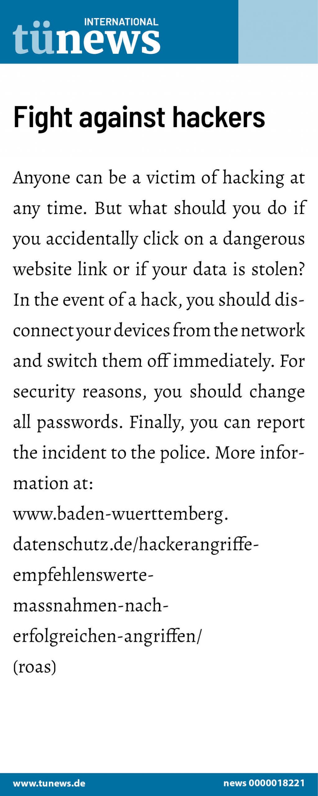 Anyone can be a victim of hacking at any time. But what should you do if you accidentally click on a dangerous website link or if your data is stolen? In the event of a hack, you should disconnect your devices from the network and switch them off immediately. For security reasons, you should change all passwords. Finally, you can report the incident to the police. More information at