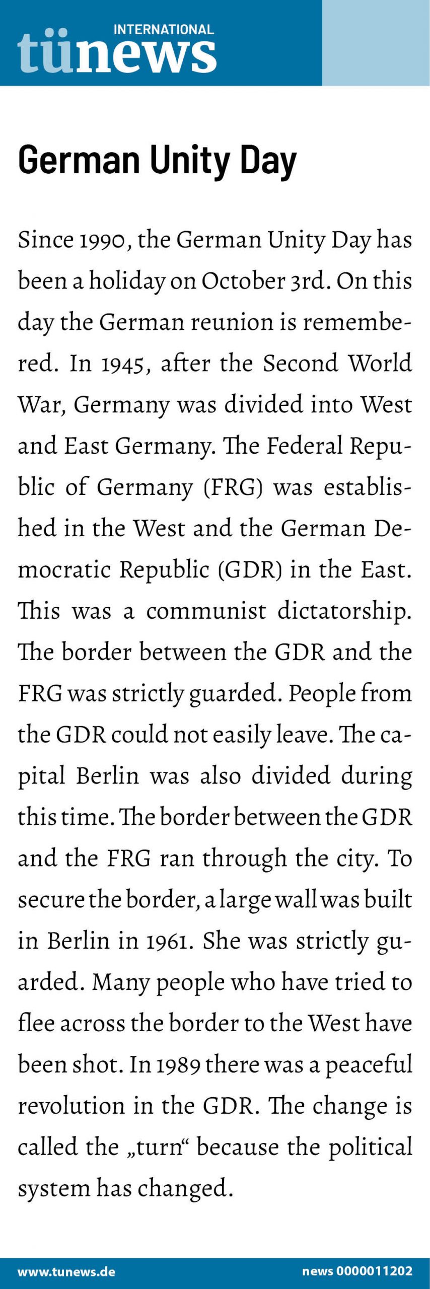 Since 1990, the German Unity Day has been a holiday on October 3rd. …