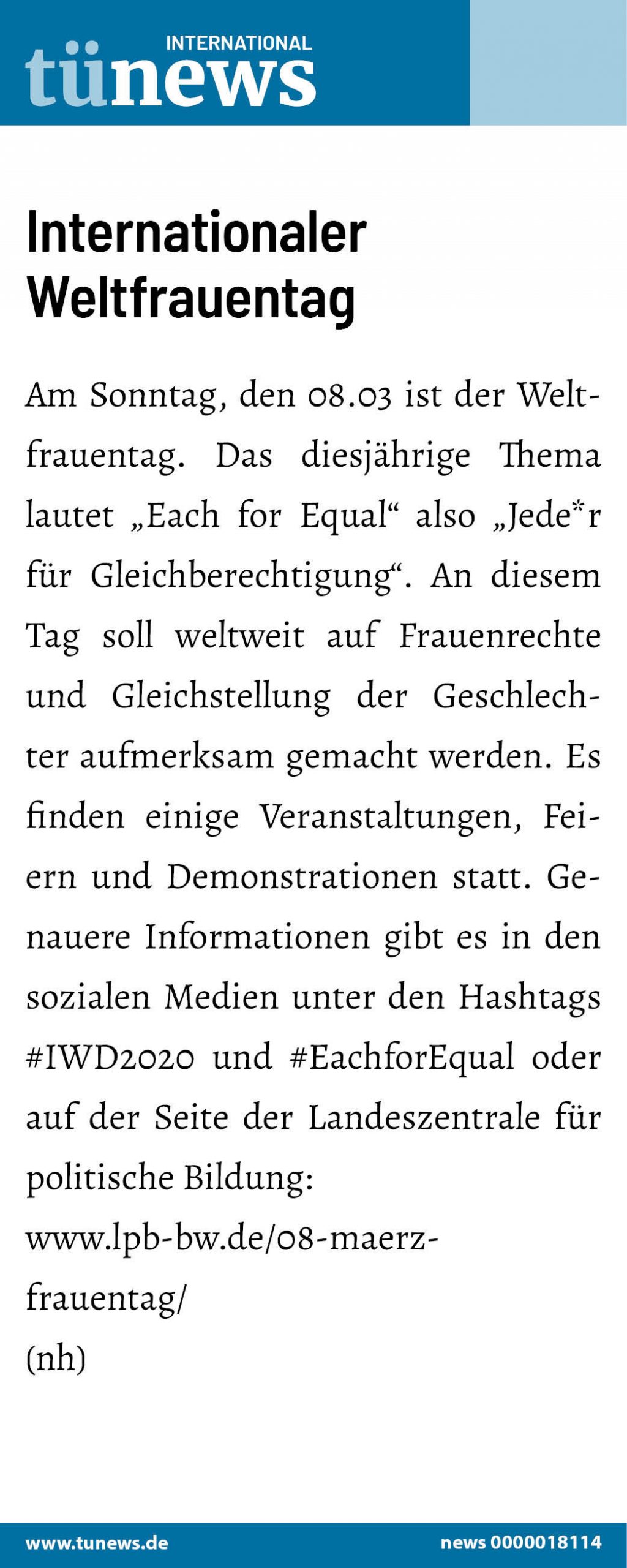 Am Sonntag, den 08.03 ist der Weltfrauentag. Das diesjährige Thema lautet „Each for Equal“ also „Jede*r für Gleichberechtigung“. An diesem Tag soll weltweit auf Frauenrechte und Gleichstellung der Geschlechter aufmerksam gemacht werden. Es finden einige Veranstaltungen, Feiern und Demonstrationen statt. Genauere Informationen gibt es in den sozialen Medien unter den Hashtags #IWD2020 und #EachforEqual oder auf der Seite der Landeszentrale für politische Bildung: