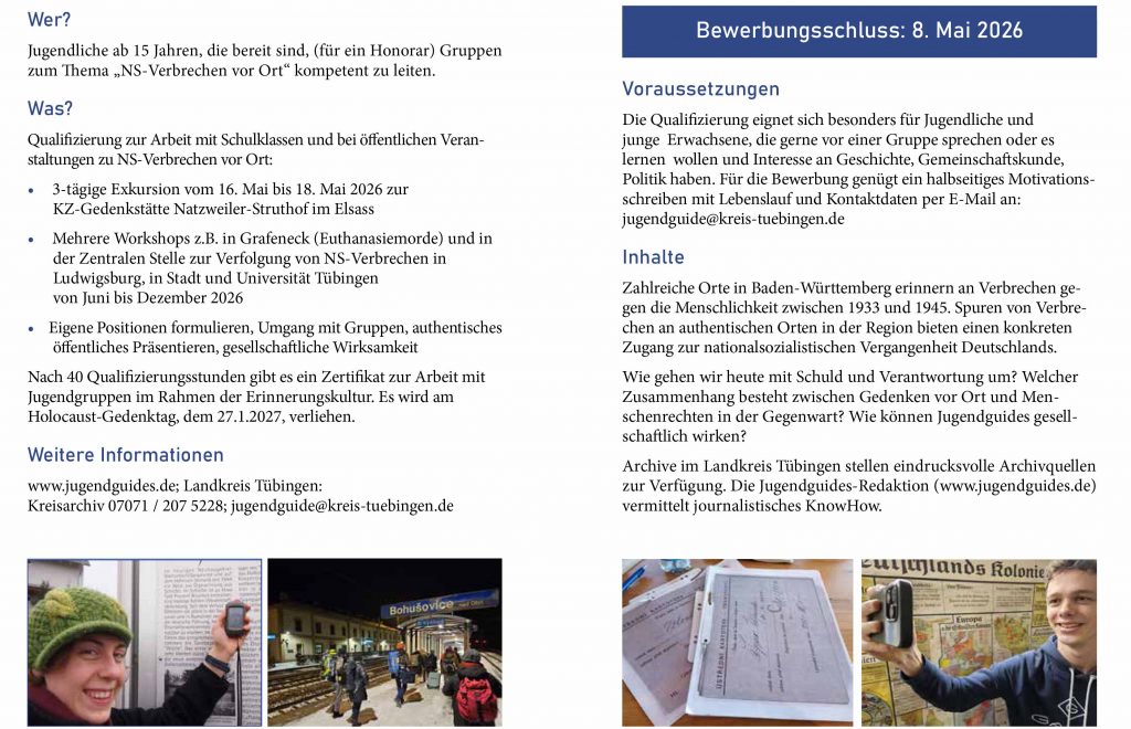 Das sei „ganz anders wie Schule“, sagen manche Jugendliche hinterher. Mit einer Exkursion vom 16. bis 18. Mai in die KZ-Gedenkstätte Natzweiler-Struthof startet die Qualifizierung von Jugendguides 2026. Der Landkreis Tübingen und KulturGUT e.V. ermöglichen Jugendlichen im Alter von 15 bis 23 Jahren die kostenfreie Teilnahme. Der Landkreis Reutlingen kooperiert. Wer mitmacht, kann an weiteren Exkursionen und Workshops das Jahr über teilnehmen. Etwa 300 Jugendliche haben bei der Qualifizierung seit 2012 gelernt, sich rasch historische Inhalte anzueignen, Geschichtsquellen zu interpretieren, ihre eigenen Positionen zum Thema NS-Verbrechen zu formulieren, in den öffentlichen Diskurs zu tragen und vor Gruppen aufzutreten. Etwa ein Drittel kam aus der Stadt Tübingen, ein DRittel aus dem übrigen Landkreis und ein weiteres Drittel aus weiteren Teilen Baden-Württembergs. Bewerbungsschluss ist der 8. Mai 2026. Wer sich bewerben möchte: Eine E-Mail an jugendguide@kreis-tuebingen.de mit einem halbseitigen Motivationsschreiben genügt!