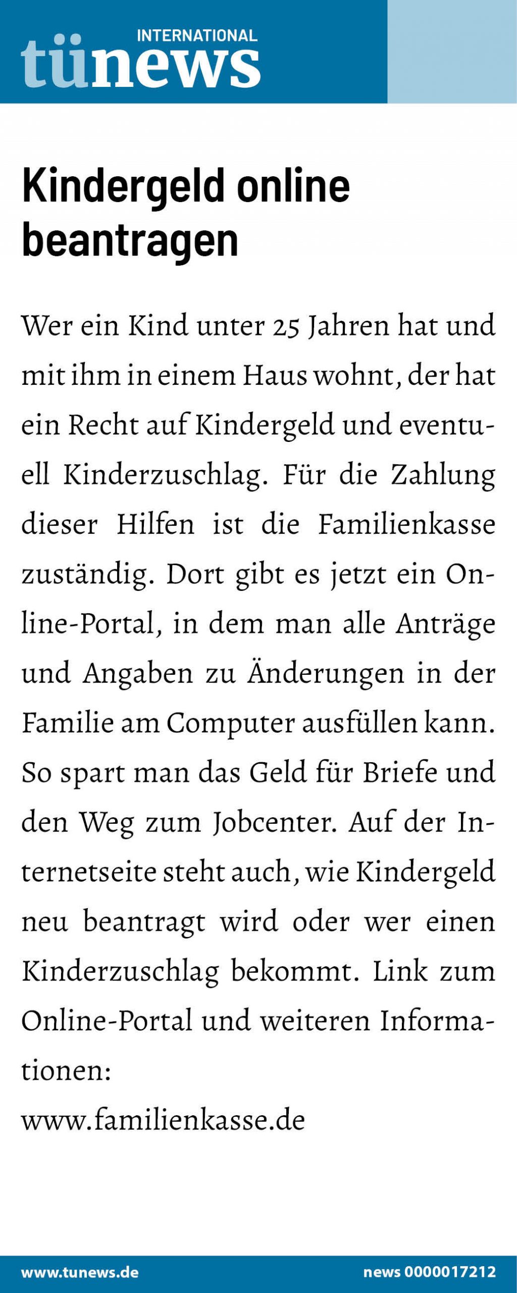 auf Kindergeld und eventuell Kinderzuschlag. Für die Zahlung dieser Hilfen ist die Familienkasse zuständig. Dort gibt es jetzt ein Online-Portal, in dem man alle Anträge und Angaben zu Änderungen in der Familie am Computer ausfüllen kann. So spart man das Geld für Briefe und den Weg zum Jobcenter. Auf der Internetseite steht auch, wie Kindergeld neu beantragt wird oder wer einen Kinderzuschlag bekommt. Link zum Online-Portal und weiteren Informationen: www.familienkasse.de