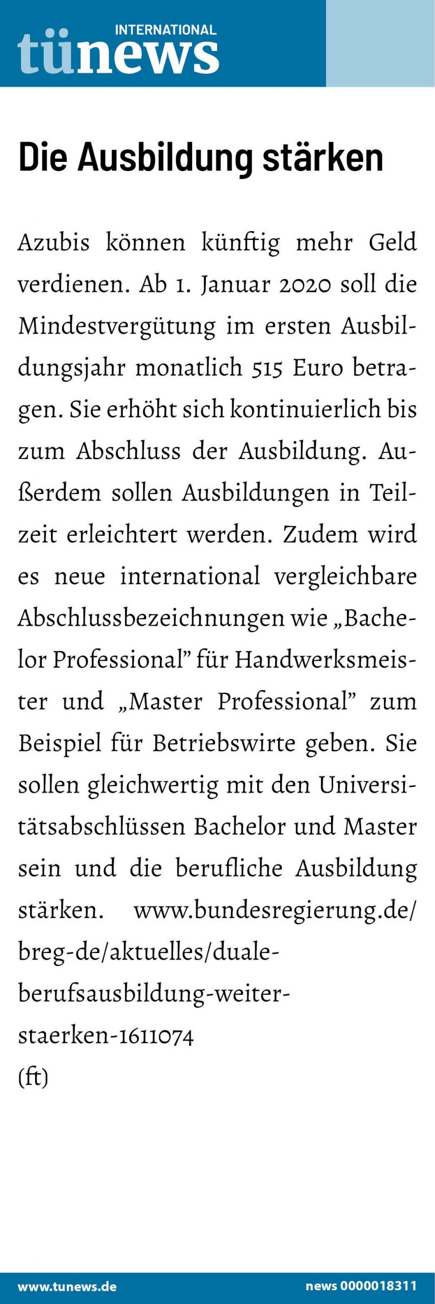 Azubis können künftig mehr Geld verdienen. Ab 1. Januar 2020 soll die Mindestvergütung im ersten Ausbildungsjahr monatlich 515 Euro betragen. Sie erhöht sich kontinuierlich bis zum Abschluss der Ausbildung. Außerdem sollen Ausbildungen in Teilzeit erleichtert werden. Zudem wird es neue international vergleichbare Abschlussbezeichnungen wie „Bachelor Professional” für Handwerksmeister und „Master Professional” zum Beispiel für Betriebswirte geben. Sie sollen gleichwertig mit den Universitätsabschlüssen Bachelor und Master sein und die berufliche Ausbildung stärken. www.bundesregierung.de/breg-de/aktuelles/duale-berufsausbildung-weiter-staerken-1611074
