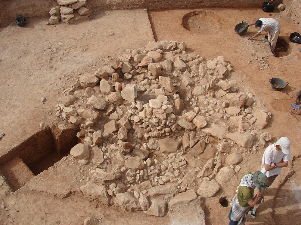 Ruinenreste eines Turms, entdeckt in Tell al-Qaramel im Norden Syriens, aus dem 10. Jahrtausend v. Chr. Der Turm und vier weitere dienten nicht als Verteidigungsanlage, sondern für religiöse oder gesellschaftliche Zusammenkünfte. Foto: Youssef Kanjou.